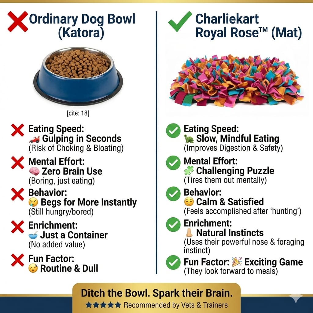 Q1. Why should I stop using a normal dog bowl? Answer: ❌ Ordinary Bowl: It encourages dogs to gulp food in seconds 💨, increasing the high risk of choking & bloating ⚠️. ✅ Royal Rose™ Mat: It promotes slow, mindful eating 🐢, which drastically improves digestion 🌿 and ensures your pet's safety 🛡️.